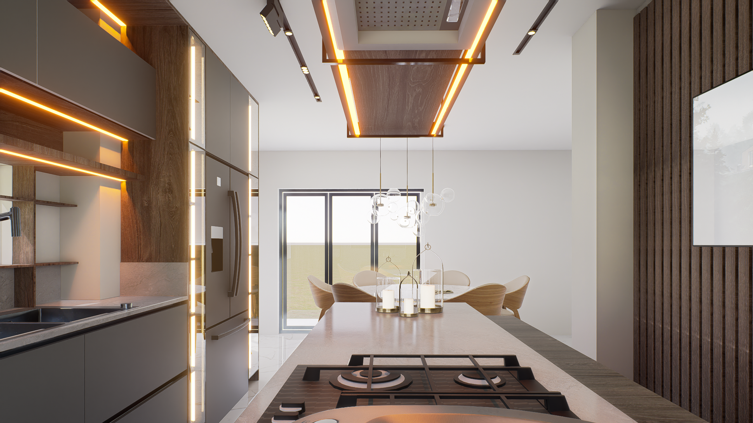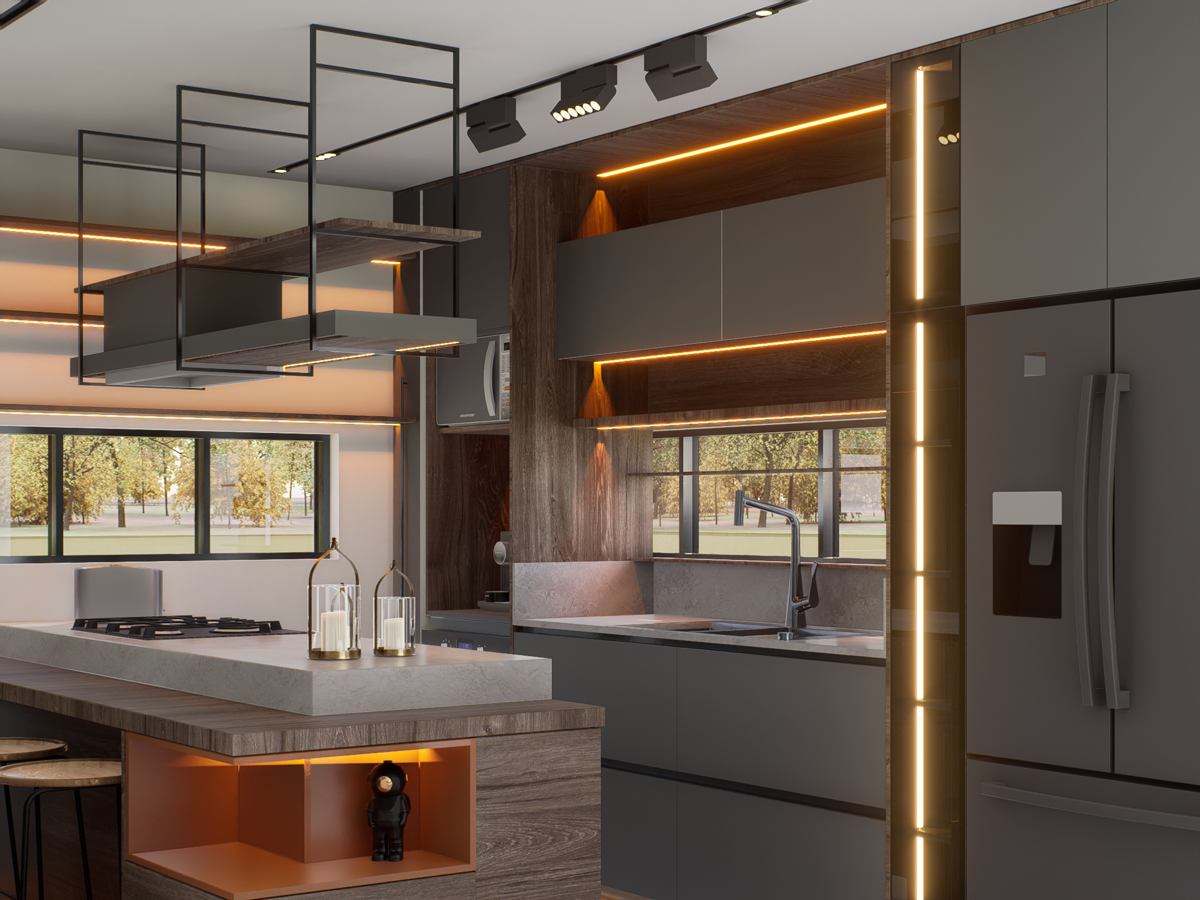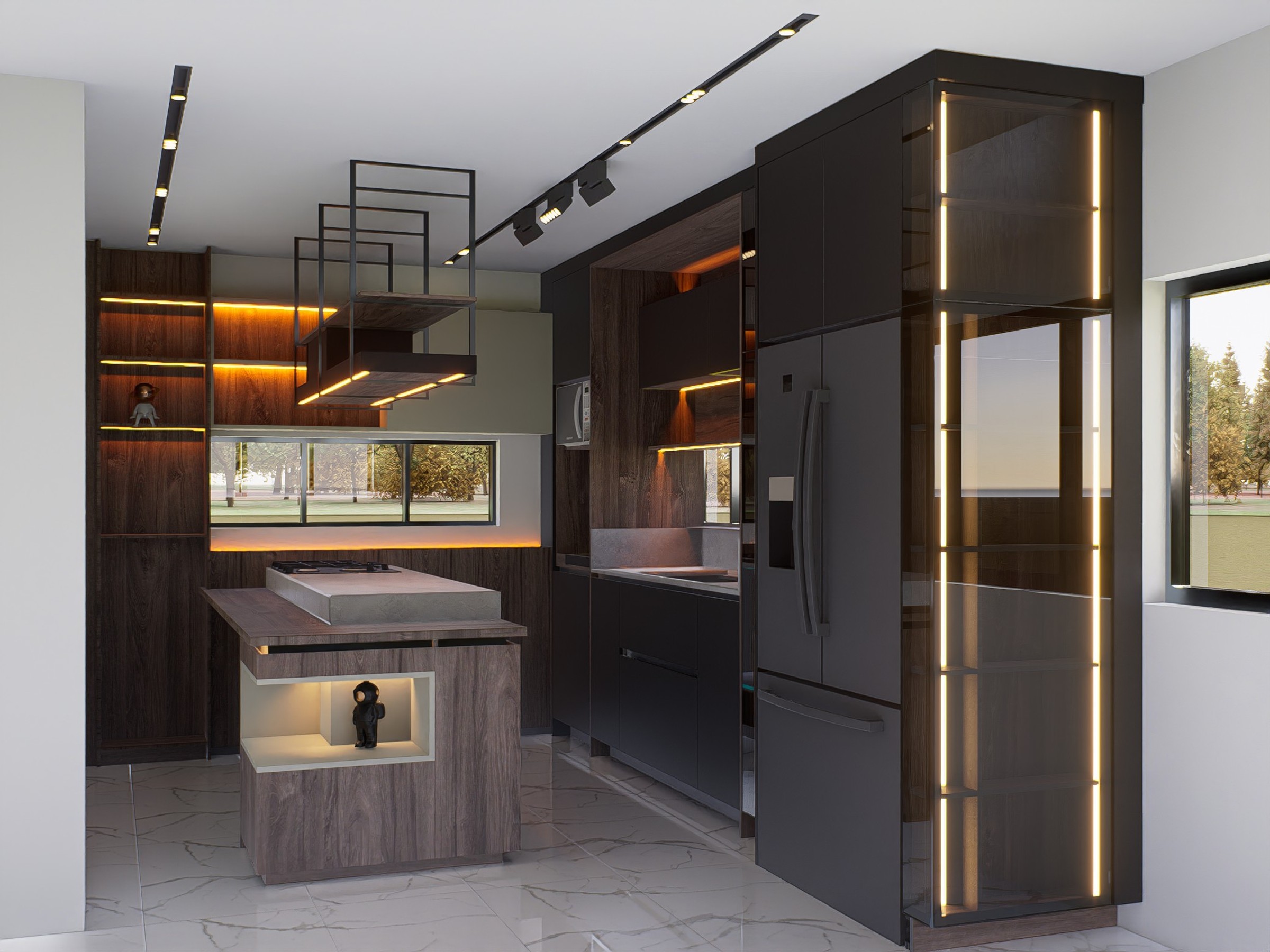 A kitchen that adapts to the family's lifestyle, a kitchen that serves as the center of the home where gatherings can take place, yet also integrates seamlessly with the other social areas of the house, adopting a contemporary industrial style that blends with the home's existing materials.