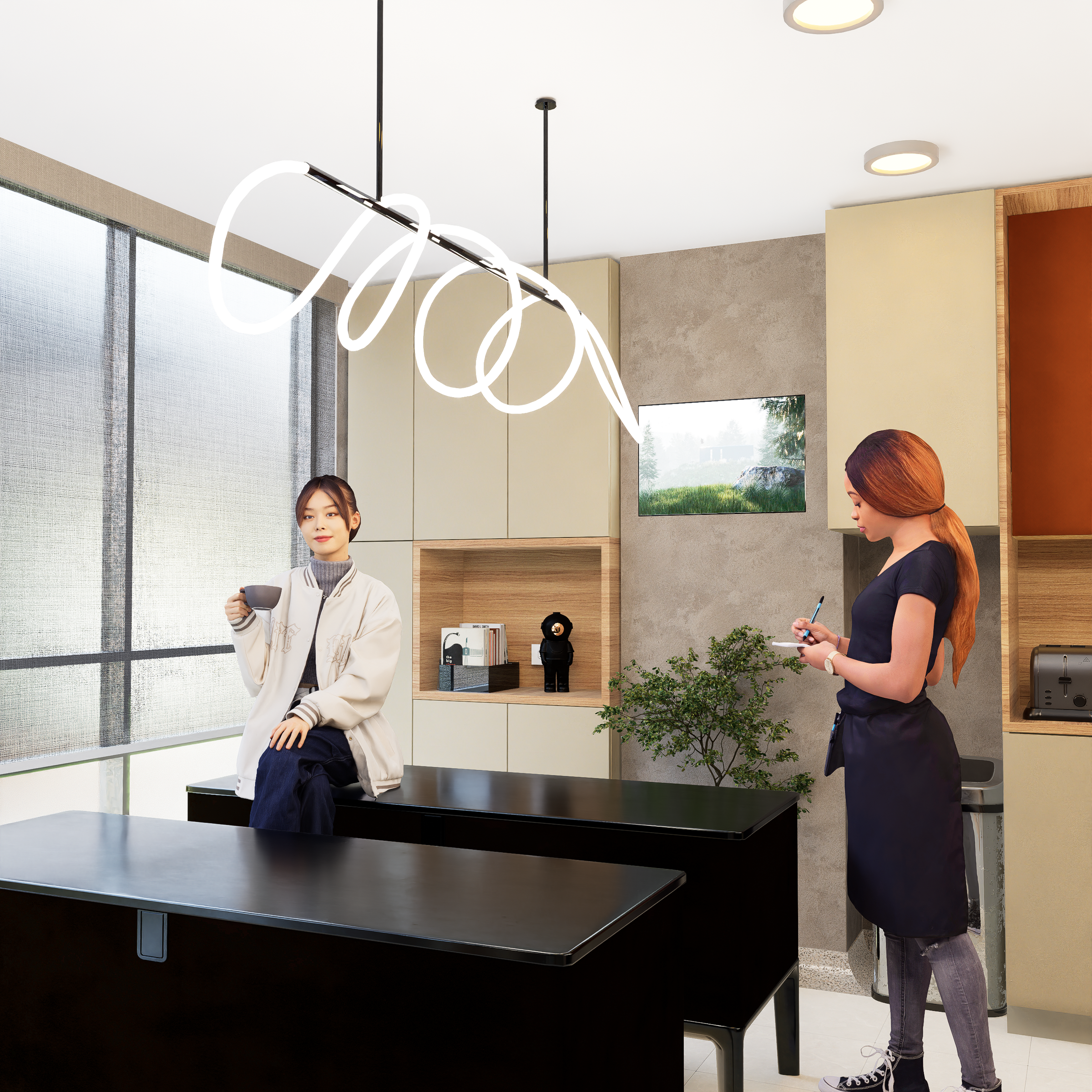 Utilizar el mobiliario para definir los espacios, evitando que llegaran al techo, y suspendiendolo del suelo para permitir una conexion visual entre los espacios en la parte inferior y superior, pero generando suficiente privacidad para el usuario o el cliente, en los espacios superiores se utilizaron especies vegetales que ayudan a suavizar el espacio y generan calidez espacial ademas de mejorar la temperatua del espacio y la calidad del aire.